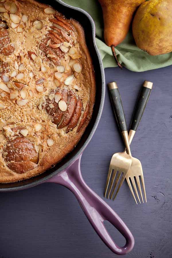 Ova verzija je bezglutenska, zapravo uopće ne sadrži žitarice i napravljena je sa bademovim brašnom. Tu je još i nerafinirani šećer. Zapravo ovaj clafoutis sadrži vrlo malo šećera, slatkoća potječe uglavnom iz krušaka. Potrebno je samo pomiješati nekoliko sastojaka, staviti na pečenje i uskoro do vas dopire miris nježnih, slatkih krušaka. Ovo je baš desert za utjehu - možemo povući paralelu sa vašim najdražim toplim i udobnim šlapicama, pomalo grubih rubova, ali neodoljivima."