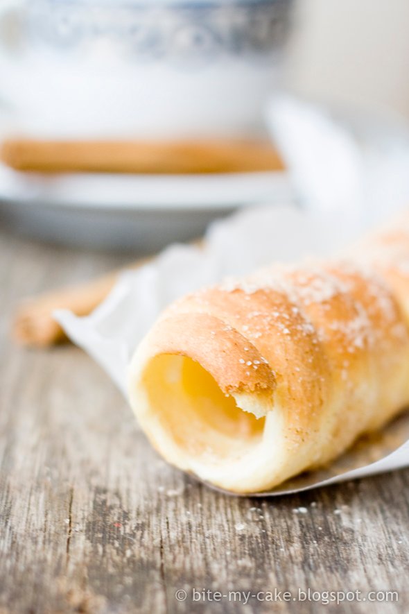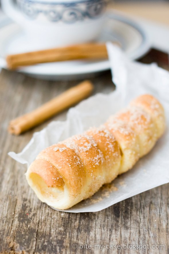 This sweet bread requires special mold for baking, something like wooden rolling pin. You can make it, but I opted for my own version of it. I made it smaller and used small molds I have for different cakes. Verdict? Nice, perfect to enjoy with a cup of coffee or tea, but it would be better if it had been baked coated in sugar and cinnamon, as it would slightly caramelize during baking.