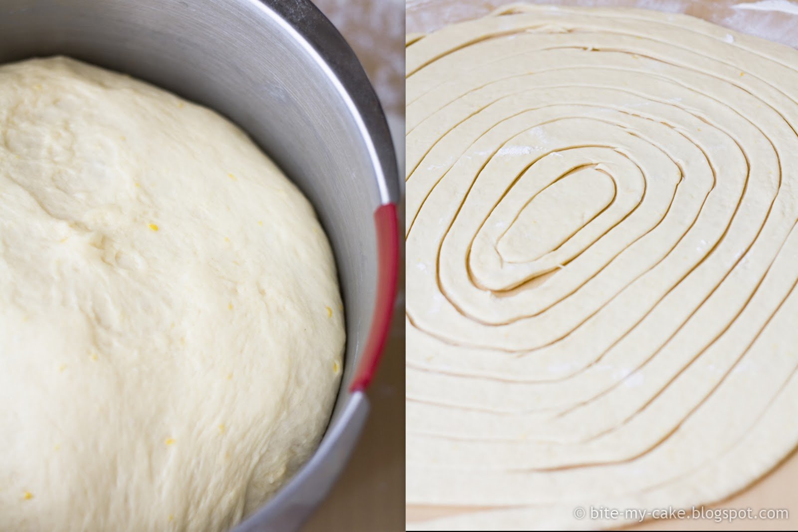 2. Combine flour, salt, lemon zest. Add egg, melted butter and yeast mixture. Knead until you form smooth dough. Cover with plastic wrap and let stand in warm place until doubled in size (1/1 and half hour).