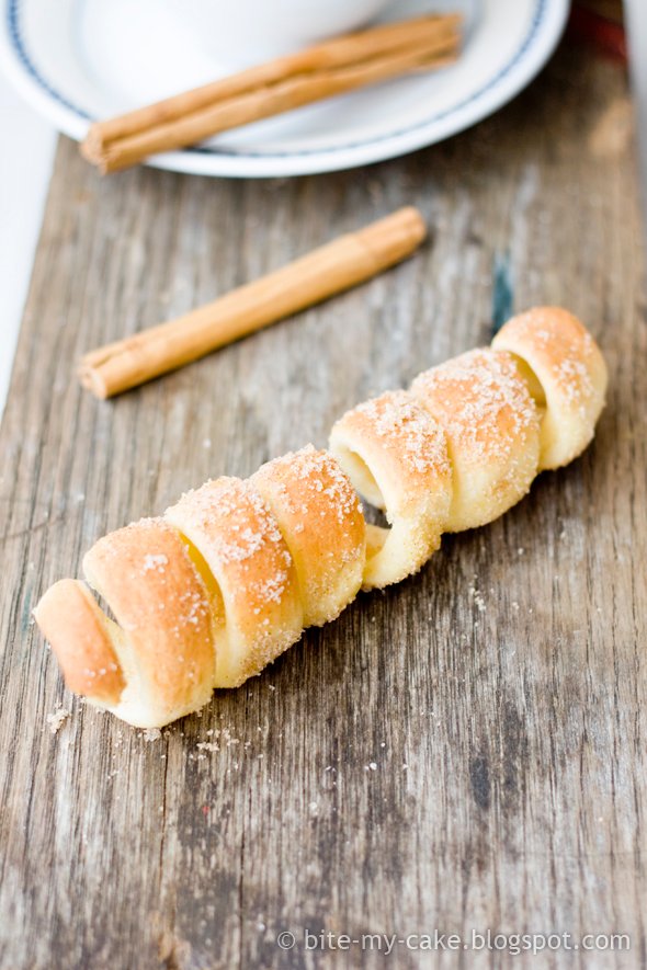 Što sam još promijenila? Kako se ovo pecivo peče na žaru i tako ravnomjerno prži sa svih strana, okrečući, ja sam ga pekla na pek papiru. Iz "straha" da mi se šećer na donjoj strani ne karamelizira (jer ne bi trebao, što nije slučaj npr. kod kruha s cimetom gdje je upravo taj efekt poželjan), pečenog i vrućeg sam ga još jednom premazala maslacem i tek tada uvaljala u šećer pomiješan s cimetom i vanil šećerom. Ipak, vjerujem da je okus bolji kada se pecivo prethodno uvalja u ovu mješavinu pa takvo peče, a i šećer se drži na njemu, ne spada.