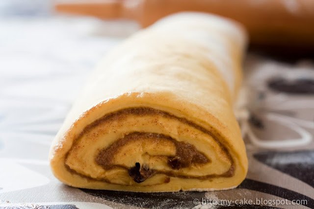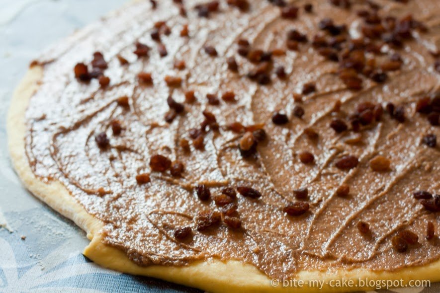 Tijesto je podatno, meko i bogato, sadrži maslac i jaja, a za nadjev sam ovaj put koristila maslac (nikako ga nemojte mijenjati margarinom), cimet, smeđi šećer (preporučam isključivo smeđi šećer, ima specifičnu "karamelastu" aromu, meni su puno ukusnije nego sa bijelim), narančinu koricu (ljepše mi se uklapa u ovu priču nego limunova), malo vanilije, orahe i grožđice. Dodala sam malo brašna koje zgusne nadjev pri pečenju, kako ne bi curio. Nema tu previše filozofije, važno je zamijesiti dobro tijesto. Neka bude mekano i dajte mu dovoljno vremena da "odmori", dva puta. Maslac za nadjev nemojte rastopiti, pustite ga samo da omekne i žlicom ga izmješajte s ostalim sastojcima, dobit ćete ljepljivu smjesu koju je jednostavno namazati po razvaljanom tijestu.