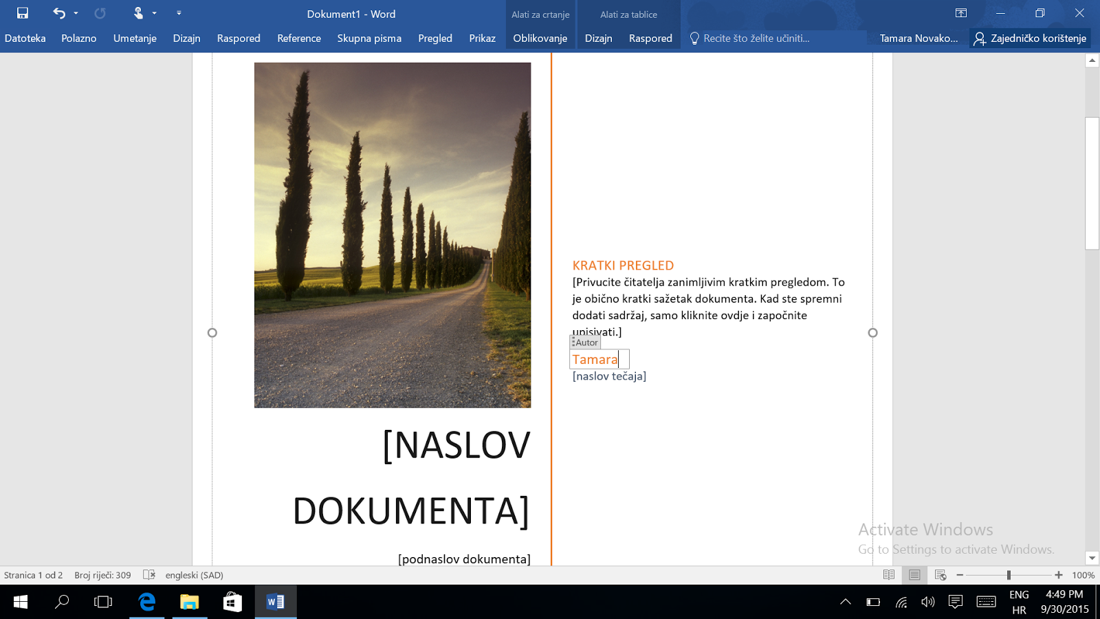 Ovdje ću govoriti uglavnom o Wordu, jer je to program kojeg najčešće koristim. Imajte na umu da na svom kompjutoru radim u Windows 7, tako da koristim stariji Word. Stoga sam pronašla popriličan broj noviteta u ovoj posljednjoj verziji Worda. Jedna od meni praktičnih novosti su gotovi predlošci za naslovnice vašeg dokumenta. Evo samo jedan primjer: