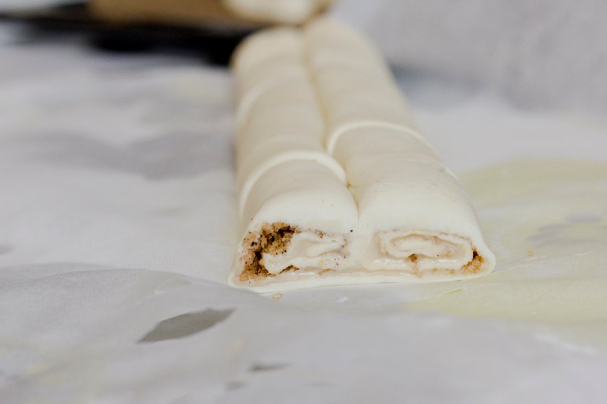 Zarolajte s obje strane prema sredini (počevši od duljih stranica pravokutnika tijesta), dok se obje zarolane strane ne susretnu na sredini. Lagano pritisnite prstima kako bi se tijesto zalijepilo te režite na šnite.