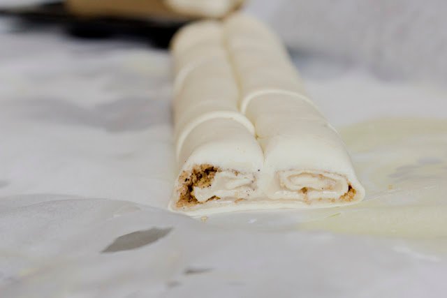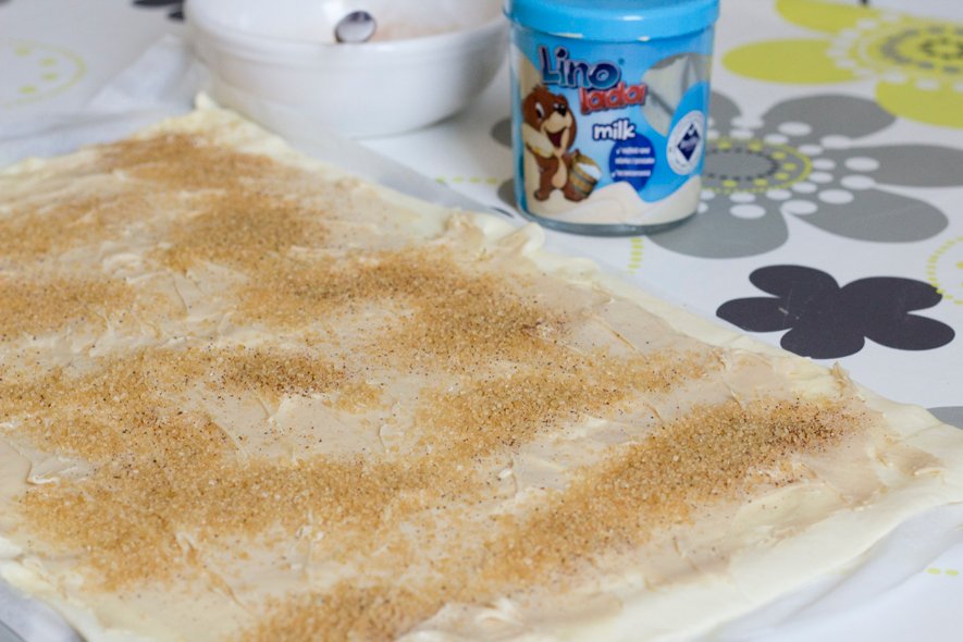 Ovakve su rolade jednostavne za izradu, naročito ako ih radite s gotovim lisnatim tijestom (uvijek kupim ono već razvaljano). Premazala sam ga Lino ladom milk i posipala mješavinom smeđeg šećera i cimeta. Umjesto Lino lade milk možete koristiti i Lino ladu nougat pa napraviti čokoladnu verziju.