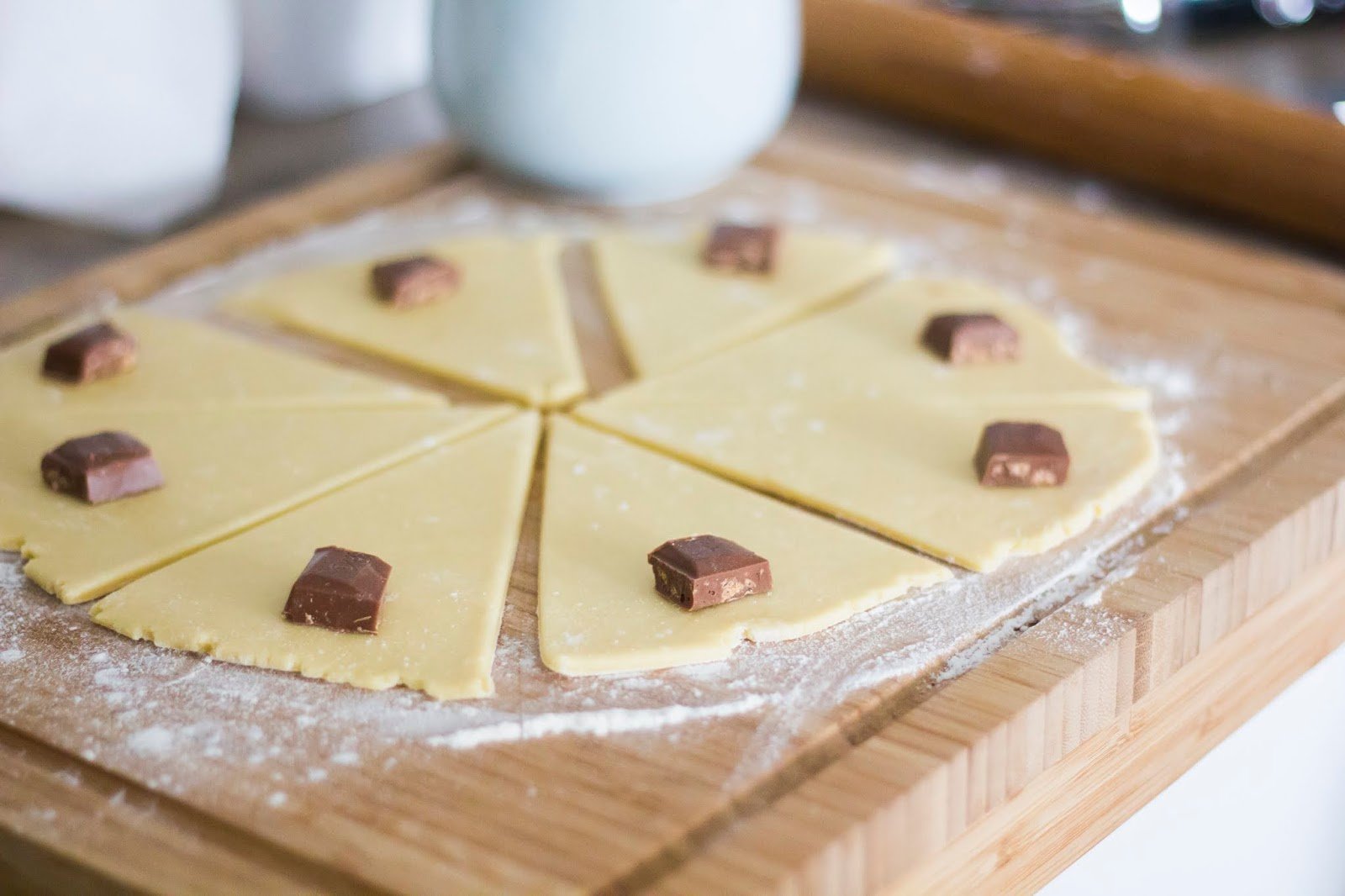 Zatim razvaljajte na pobrašnjeloj podlozi (ili još bolje na papiru za pečenje) u krug te režite trokutiće. Na početak svakog stavite kockicu čokolade i zarolajte u kiflicu. Slažite kiflice na pleh obložen papirom za pečenje.